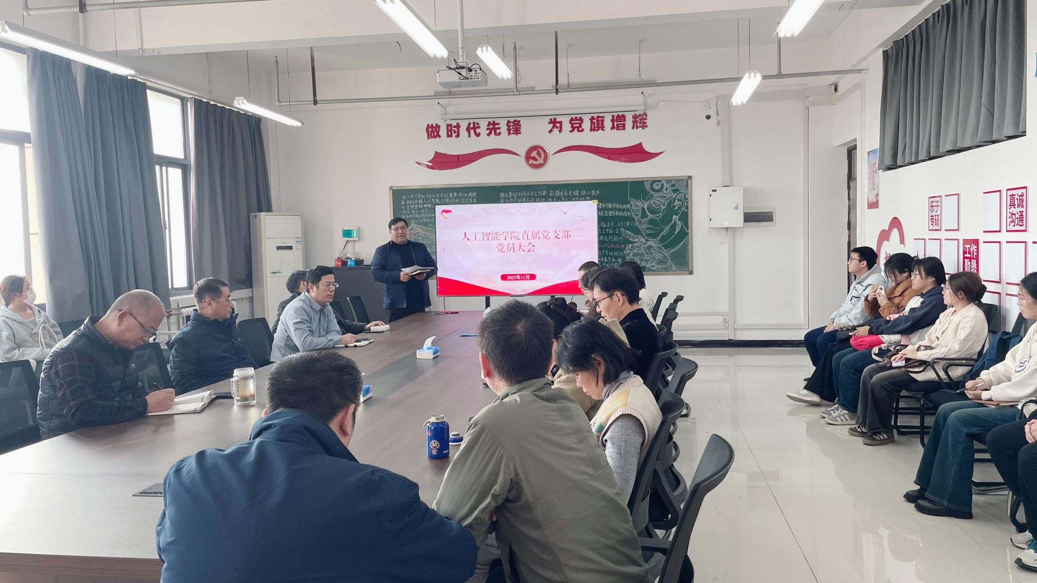 直属党支部在A915会议室召开党员大会深入学习贯彻党的二十届四中全会精神。会议由直属党支部副书记张志鹏主持,学院全体师生党员参会。