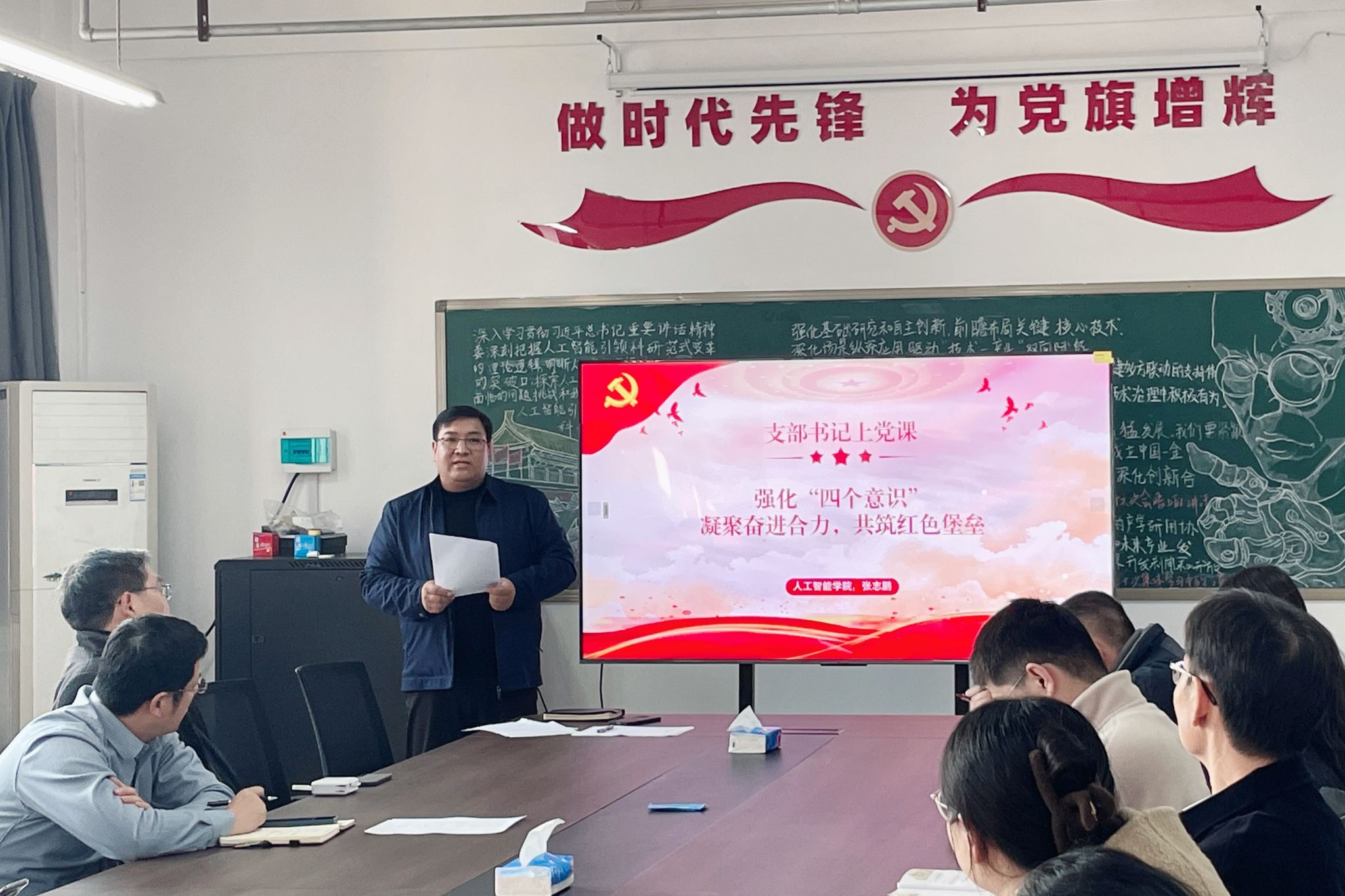 随后,张志鹏结合学院自2023年建院以来的发展历程,以《强化“四个意识”,凝聚奋进合力,共筑红色堡垒》为题讲授专题党课。他指出,面对百年未有之大变局和人工智能作为科技竞争主战场、意识形态交锋新前沿的双重挑战,全体党员必须自觉增强政治意识、大局意识、核心意识、看齐意识,将“四个意识”内化于心、外化于行。